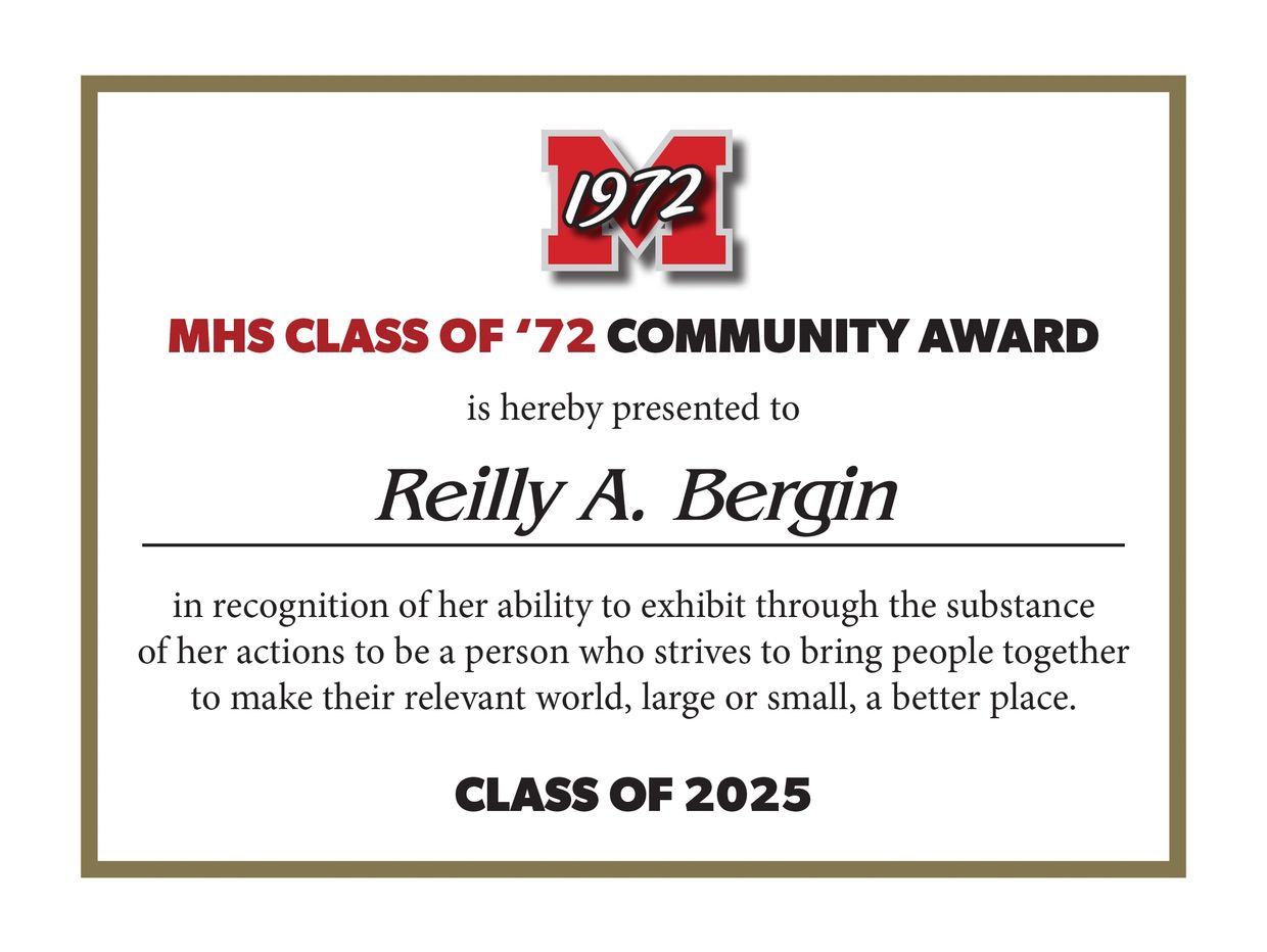 The Milton High School Class of 1972 Scholarship/Reunion Committee is proud to present our third MHS Class of '72 Community Award to Reilly A. Bergin. This award was announced at the MHS Class of 2025 Awards Night on Tuesday, May 27, 2025 by Class Vice President Joseph Gibbons and Class Secretary Ruth Pinkus.
